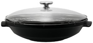 Emile Henry Flame-Top ceramic cookware is light and versatile, an innovative breakthrough in ceramic technology. The Burgundy Clay Flame-Top ceramic products work directly on any stove top (gas, electric, glass or halogen hob), without any fear of cracking or breaking. Much lighter, (30-percent lighter), than many types of comparable metal cookware products, Flame-Top base is microwave and dishwasher-safe, goes under the broiler, and can go directly from a freezer to a hot oven. The incredibly gentle heat distribution properties of Burgundy Clay makes it a cooking vessel perfect for sauteing meat and vegetables, frying, steam cooking or simmering. Flame-Top products cook evenly and thoroughly when used on top of the stove, in the oven or even in the microwave. Emile Henry Flame-Top ceramic cookware is light and versatile, and better brings out the flavors of all cooked foods. A 5-quart capacity, the Flame Top Wok set comes with oven proof tempered glass lid and tempura rack for steam cooking or frying.