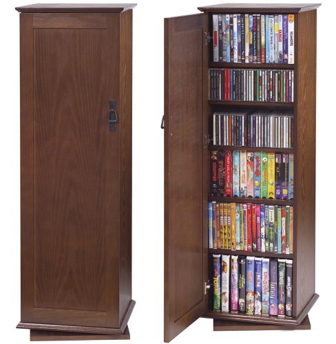 This Multimedia storage cabinet has plenty of room and style to meet all of your requirements when displaying and storing your music or movie collection. The revolving-style tower allows quick and easy access. This storage cabinet has decorative metal hardware, molding and an overhang top. Features: Media storage tower is available in Oak or Walnut finish Media storage tower holds 500 CDS or 244 DVDs and 28 CDs Or in any combination Door uses furniture quality hinges Precision Ball bearing Base Assembles quickly and easily Specifications: Overall dimensions 15.75" W x 14.5" D x 50" H