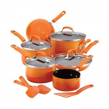 Rachael Ray® Porcelain II cookware provides superior performance in fun colors and durable materials. This 13-piece cookware set will add 13 times the style to any kitchen and make it easy to tackle recipes of any size. The nonstick interiors provide impeccable food release and make cleaning up a breeze. The sturdy construction promotes even heating, helping to reduce hot spots that can burn foods, and the hard enamel exteriors in a fun two-tone gradient hue are not only colorful, but durable too. The rubberized dual-riveted handles offer strength and a comfortable grasp while cooking and are oven safe to 350°F. The tempered glass lids are strong and make it possible to keep an eye on food without having to lift the lid. The set even comes with three fabulous tools that will help with tons of recipes: a spatula, a spoonula and a lil' devil - a spatula with a pointed edge that can get into places other spatulas can't.Set Includes:* 1-Qt Pouring Saucepan* 2 and 3-Qt Cov Saucepans* 6-Qt Cov Stockpot* 8-In Skillet* 10-In Cov Skillet* Large Lil' Devil* Medium Spatula* Large SpoonulaFeatures:* Durable nonstick interiors provide exceptional food release and make the cookware easy to clean* The comfortable grippy handles are dual riveted for extra strength and are oven safe to 350 degrees Fahrenheit* Sturdy tempered glass lids on covered pieces form a tight seal with the cookware to help lock in heat and moisture